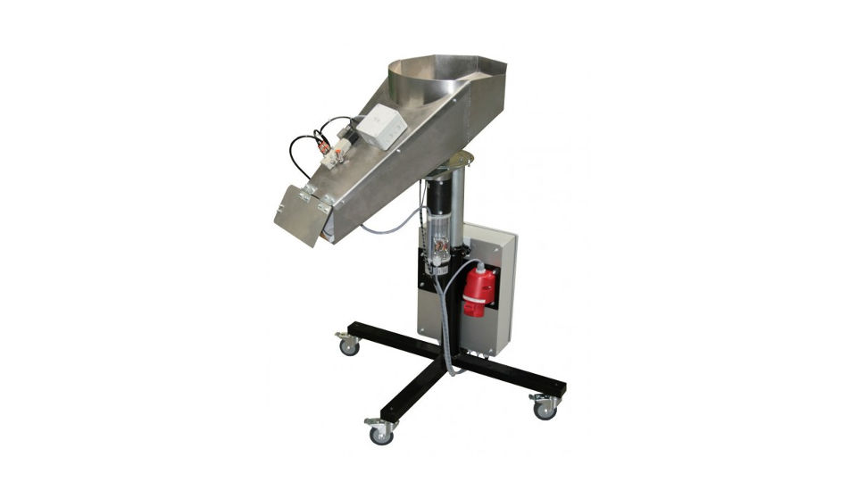 Multi-Rounder Type MR-S1 Special with outlet chute in stainless steel, (patterned design). The chute is covered in order to prevent parts from jumping out. The cute closes the outlet during the movement, when the parts feeding cannot be interrupted.