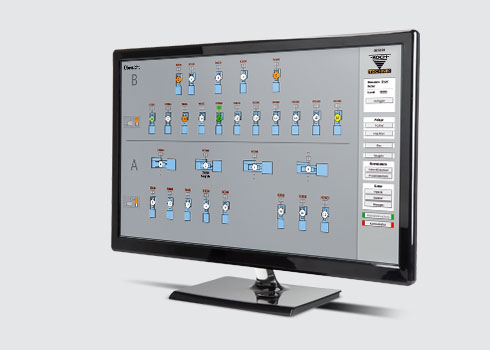 The station monitoring (hopper loaders monitoring) component of the KOCH visualisation system shows an overview of the whole system.