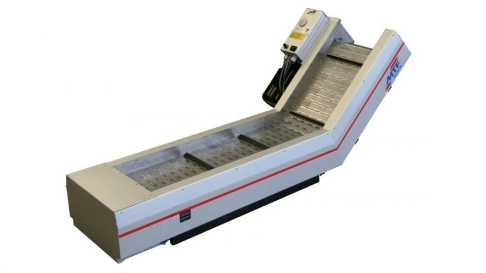 The angled conveyors with steel hinged plates are essential for transporting hot materials out of machine shafts, as this often happens, for example, in the die casting industry. Likewise they serve to transport strongly lubricant-containing pieces and chips that occur during machining. The entire configuration, from length and width to the surface of the plates, is laid out to order by MTF Technik. Fixed angles of 30°, 45°, 60° and 75° are offered as standard.