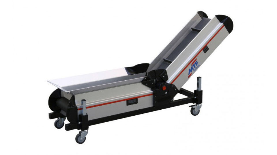 The MTF Multi-Tech angled belt conveyors are probably unique on the market with regard to processing quality and functionality. The patented belt tensioning mechanism ensures that the belt tension remains constant and balanced over the entire angle adjustment range between 0° and 60°. The combination of the high-quality materials for outer belts covers effectively prevents the belt from forming a bump in the belt bend and thus, from wearing out. The MTF angled belts therefore do not need a forcible belt guide and control. This reduces wear and downforce. Stable bend covers, chain protection parts and protection parts for belt rotation made of aluminium make these belt conveyors extremely resistant and reliable assistants in your production.