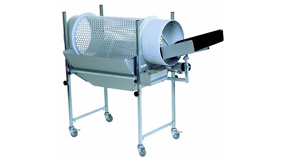 Special separation drum type for separation, for example, of plastic pieces (from sprue) that are the same in height but differ in surface area. Also well suited for separation of stamped pieces from stamp remnants. Thus the smaller pieces fall through the holes, while the larger pieces continue to the output side. The height and tilt of the drum are infinitely adjustable.