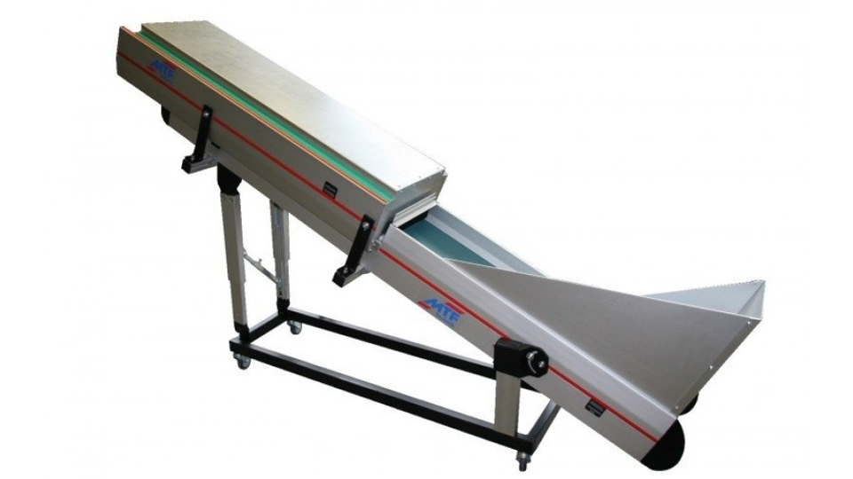• Combination of a belt conveyor that lies below and a magnetic conveyor that stands above it