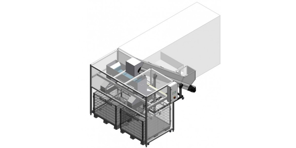A műanyag fröccsöntött darabokat közvetlenül a gépből való kilépés után egy meredeken emelkedő, zárt szállítószalagon keresztül egy lineárisan eltolható elosztószalagra szállítja. A megfordíthatóan futó szalag két, mindkét végén elhelyezett háromirányú kapcsolót használ. Így összesen 12 zsákot töltenek meg.