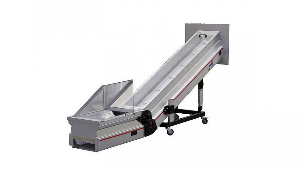 Angled conveyors in L-shape are equipped with the underframe LD 020, if the flat belt part is to be lowered until the floor and at the same time, only very few underframe parts may protrude on the sides.