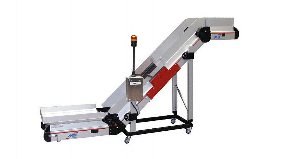 - Freely overhanging flat belt parts enable low feeding heights and unhindered disposal e.g. into larger containers or boxes